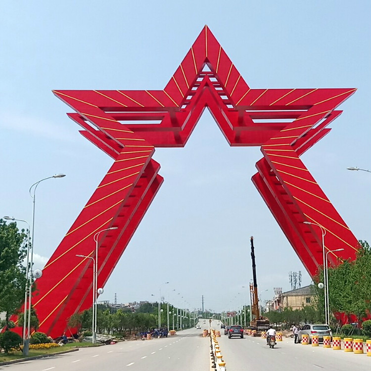 該大型不銹鋼五角星雕塑項(xiàng)目位于葉坪景區(qū)區(qū)域,此大型不銹鋼雕塑高52米,寬65米,橫跨蘇維埃大道,由三組鋼構(gòu)五角星組成,是世界上第一大的不銹鋼五角星雕塑!內(nèi)部采用鋼結(jié)構(gòu),表面采用不銹鋼板噴佛碳漆,設(shè)計(jì)靈感取自于中華蘇維埃共和國國徽,高大的五角星雕塑寓意著瑞金這塊土地永遠(yuǎn)放光芒!